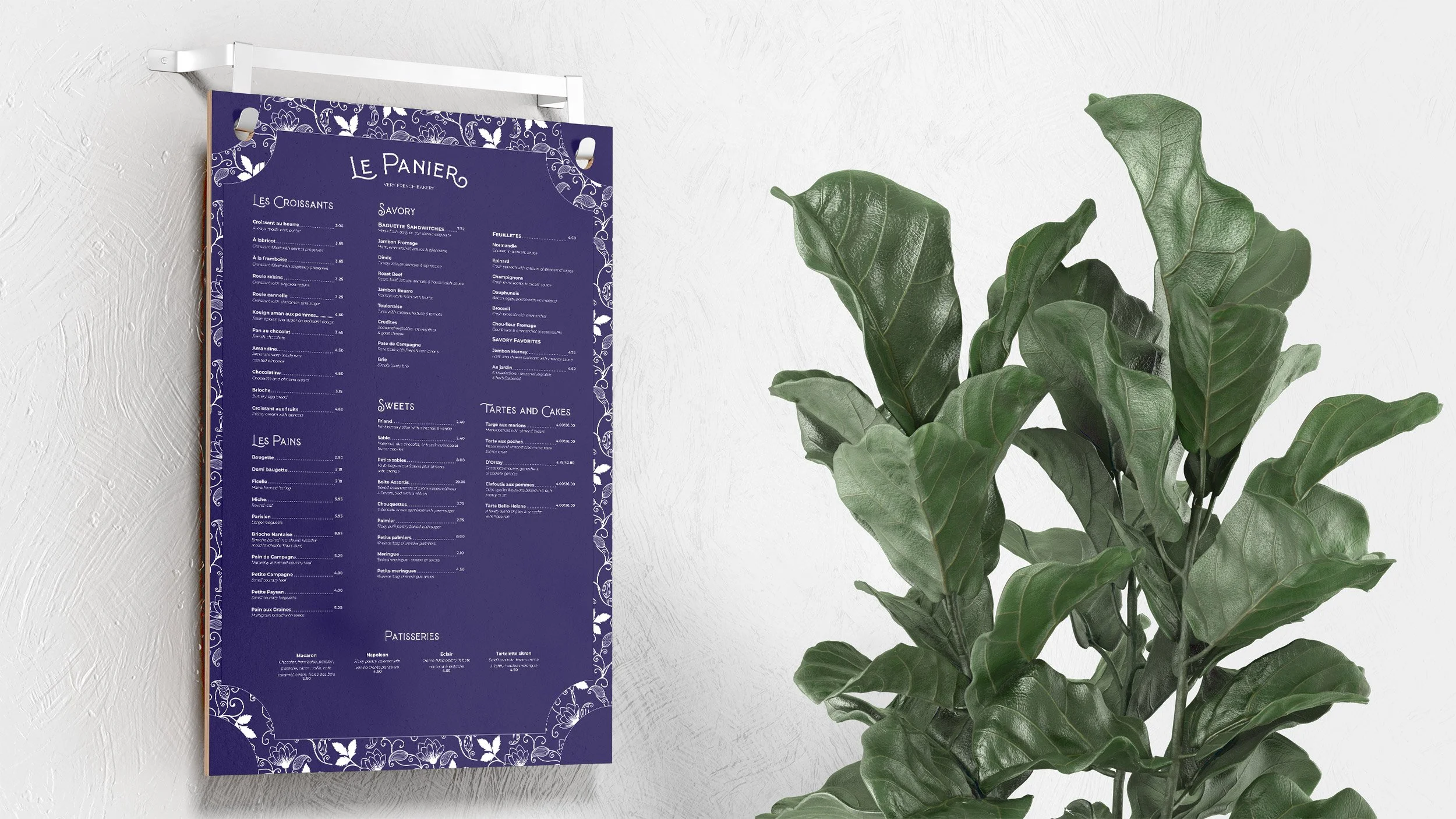 This project was such a fun challenge to take on. With this being a French-inspired bakery, I found much of my inspiration from Parisian signage and bakeries with natural, flowing patterns and decorative typography. The practical mockup is laser-engraved on clear acrylic which was painted on the back for the blue color, with the words painted white with acrylic paint.